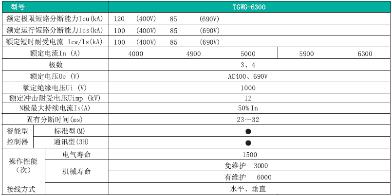 TGWG 系列万能式断路器,适用于交流50Hz,额定电压AC380V~AC690V,额定电流200A~6300A 的配电网络中,用来分配电能和保护线路及电源设备免受过载、短路、欠电压、单相接地或剩余电流等故障的危害。该断路器具有可通信及智能化保护功能,能提高供电可靠性,避免不必要的停电。